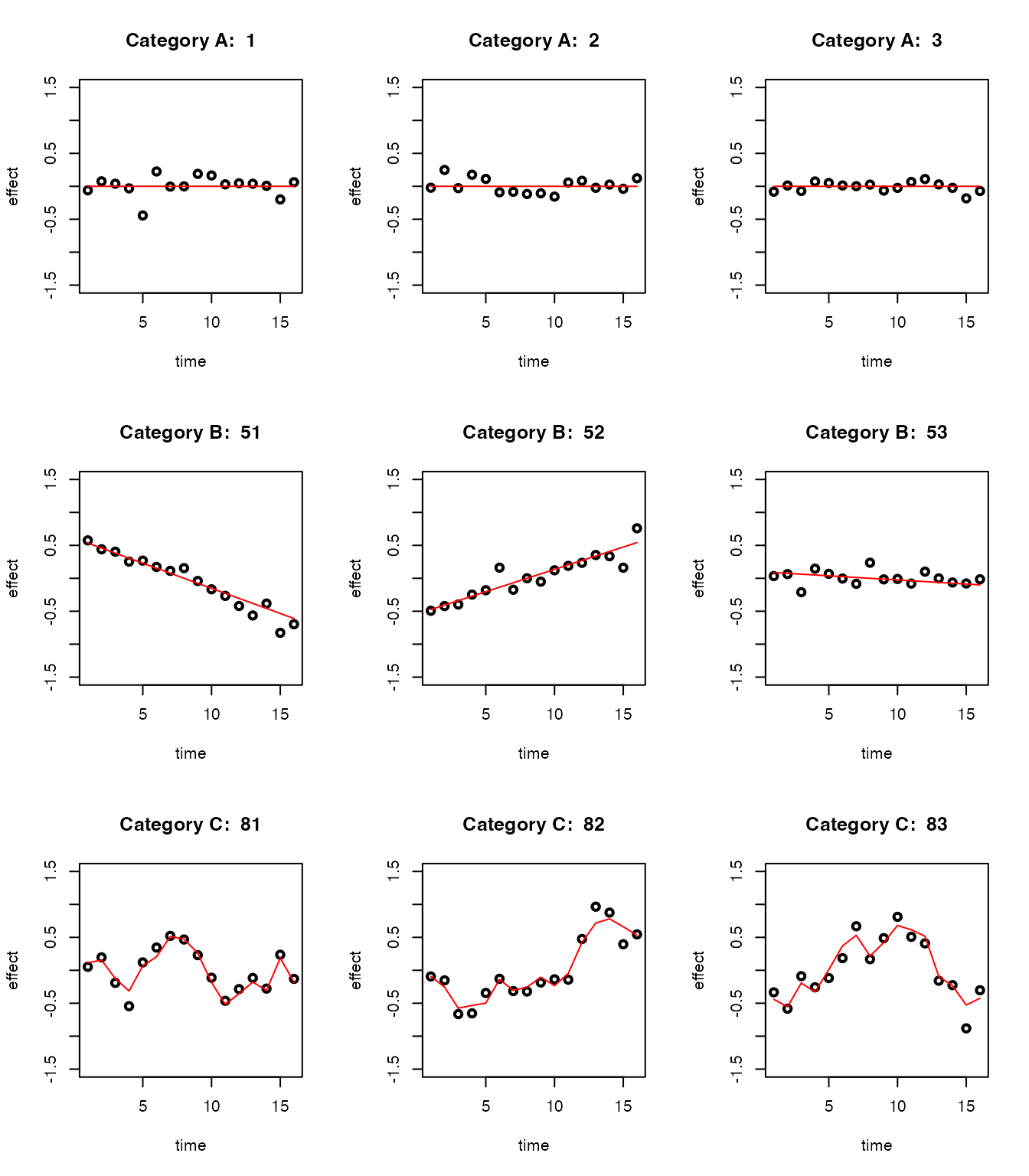 plot(datasets[[i]]$x, datasets[[i]]$y, type = "p", col = "black", lwd = 2, xlab = "time", ylab = "effect", ylim = c(-1.5, 1.5), main = paste("Category C: ", i))