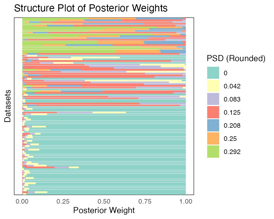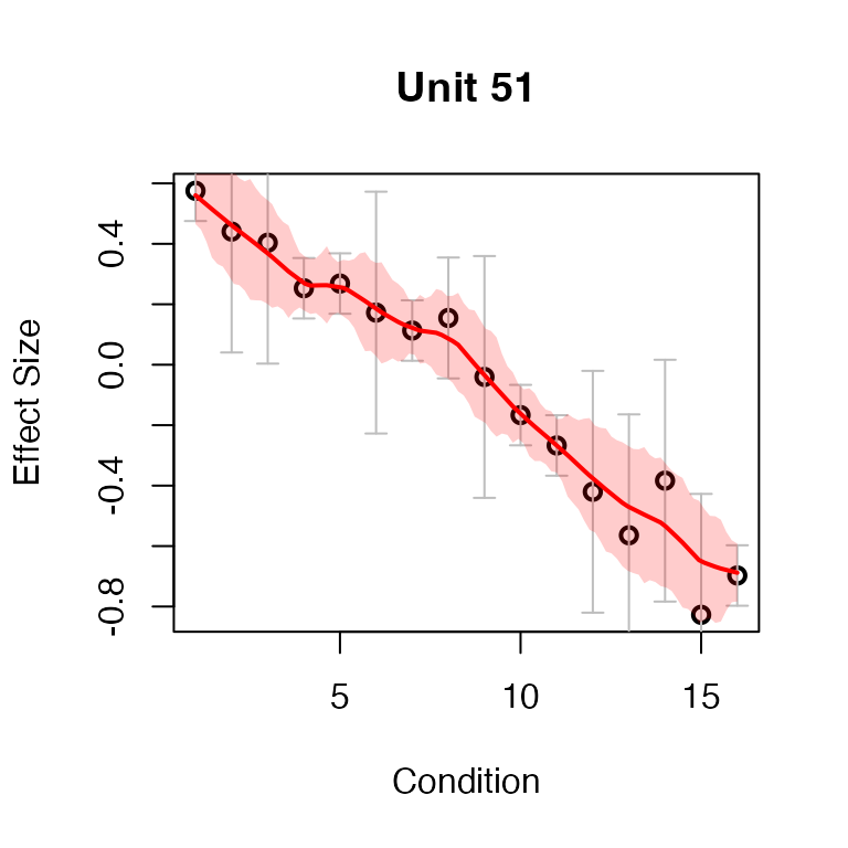 # num [1:100, 1:50] 0.648 0.648 0.648 0.648 0.648 ...Using these results we can visualize, for example, the posterior mean effect estimate: