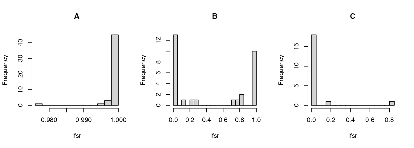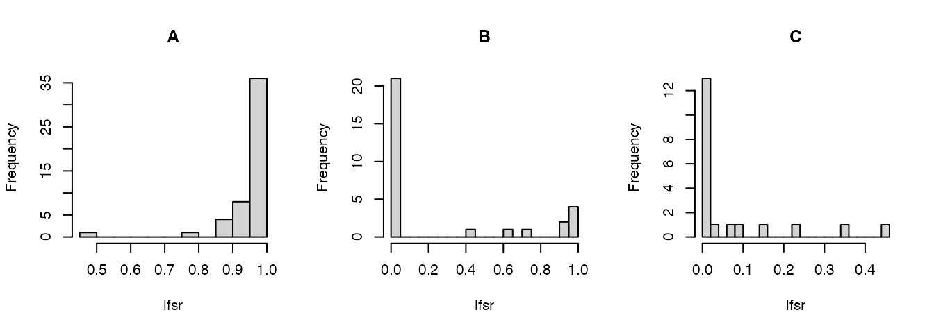 hist(lfsr_result[indices_A,"lfsr"],n = 16,main = "A",xlab = "lfsr")