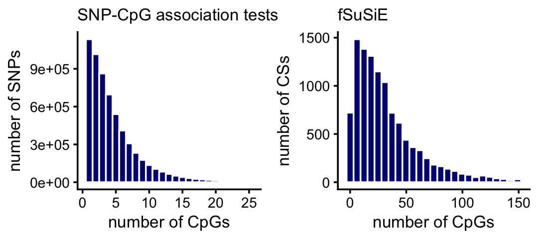 One advantage of fSuSiE is that it is able to tell us which molecular features are affected by which SNPs, and therefore it provides a more coherent summary of how the SNPs affect methylation levels at a locus. To examine this quantitatively, we compare the number of affected CpGs per CS for fSuSiE to the number of affected CpGs per SNP from the association tests. The result is much fewer CSs and many more affected CpGs per CS: