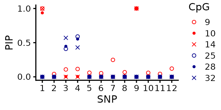 fit_TI <- susiF(Y,X,L = 3,filter_cs = FALSE,prior = "mixture_normal" )Note that the post-processing step doesn’t change the CSs (nor the PIPs), only the estimated effects of the SNPs on the CpGs.