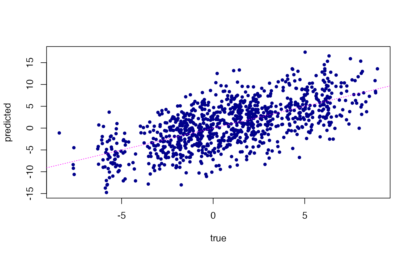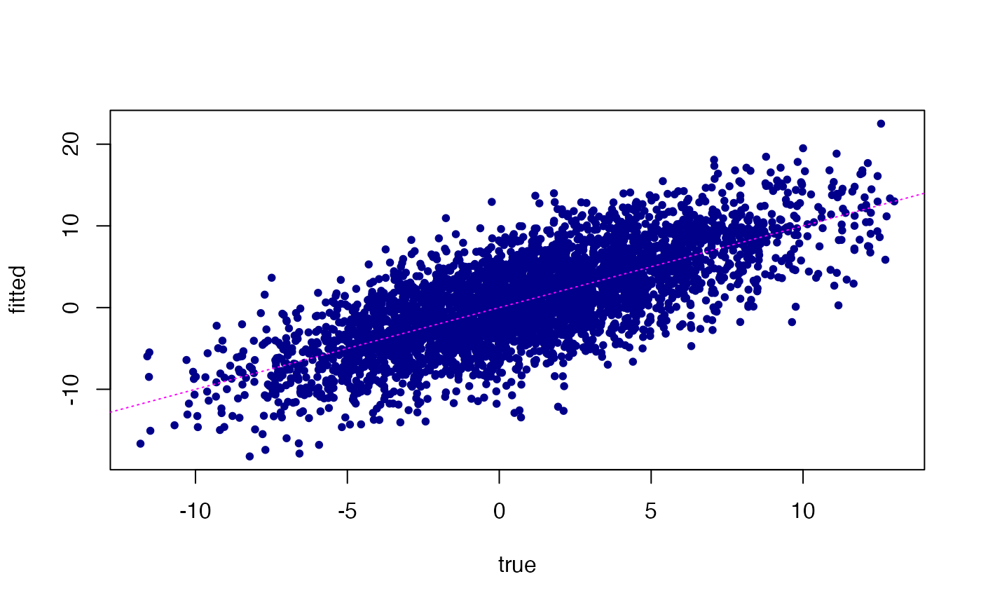 plot(fit$fitted,Ytrain,pch = 20,col = "darkblue",xlab = "true",