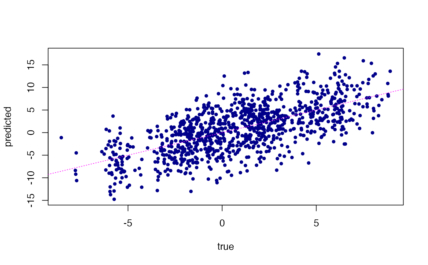 plot(Ytest_est,Ytest,pch = 20,col = "darkblue",xlab = "true",